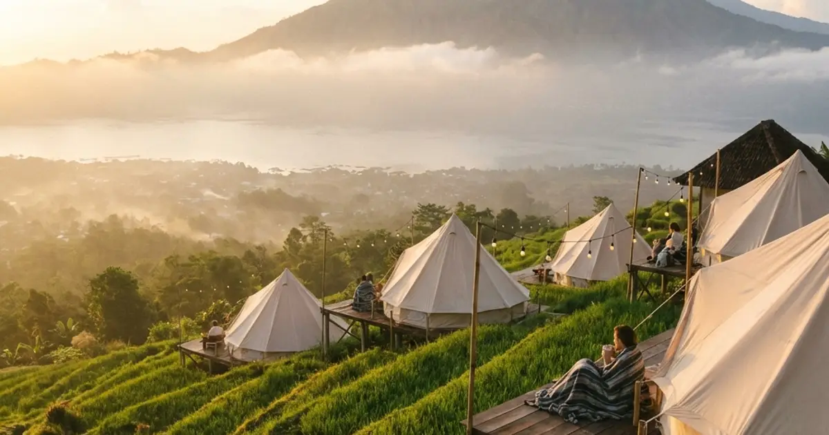 Pinggan Glamping Hill berlokasi di desa Pinggan yang terkenal dengan pemandangan sunrise spektakuler di Bali. Glamping ini menawarkan pengalaman menginap di tengah perbukitan dengan udara segar pegunungan. Cocok untuk fotografer dan pecinta alam yang ingin menyaksikan keindahan sunrise Bali dari ketinggian. View Gunung Batur dan Gunung Abang di kejauhan menambah pesona lokasi ini.