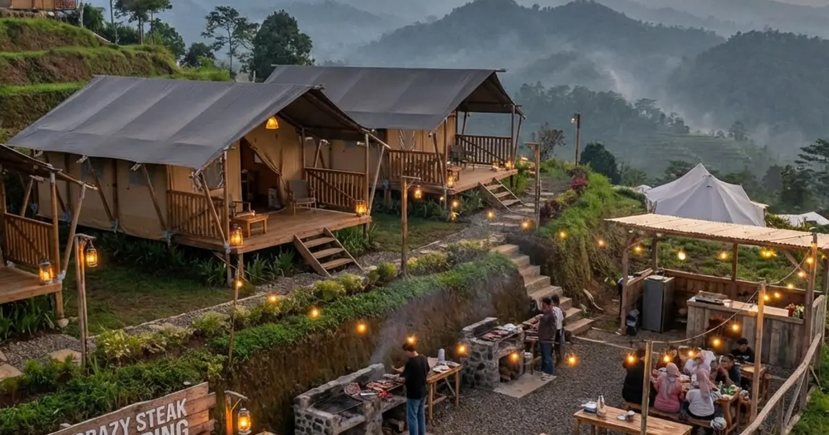 Crazy Steak Resort Glamping menggabungkan pengalaman glamping dengan kuliner steak premium. Berlokasi di Puncak dengan view pegunungan yang indah, resort ini menawarkan konsep western yang unik. Cocok untuk pecinta kuliner yang ingin menikmati steak berkualitas sambil menginap di alam.